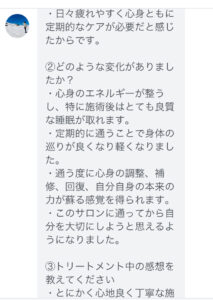 「通う度に自分自身の本来の力が蘇る感覚を得られます。このサロンに通ってから自分を大切にしようと思えるようになりました。オーナーさんはとにかく明るく全肯定してくださり、隅々までケアしてくださる安心感に、次回の訪問日まで頑張る元気をいただけます。」(40代・S様)