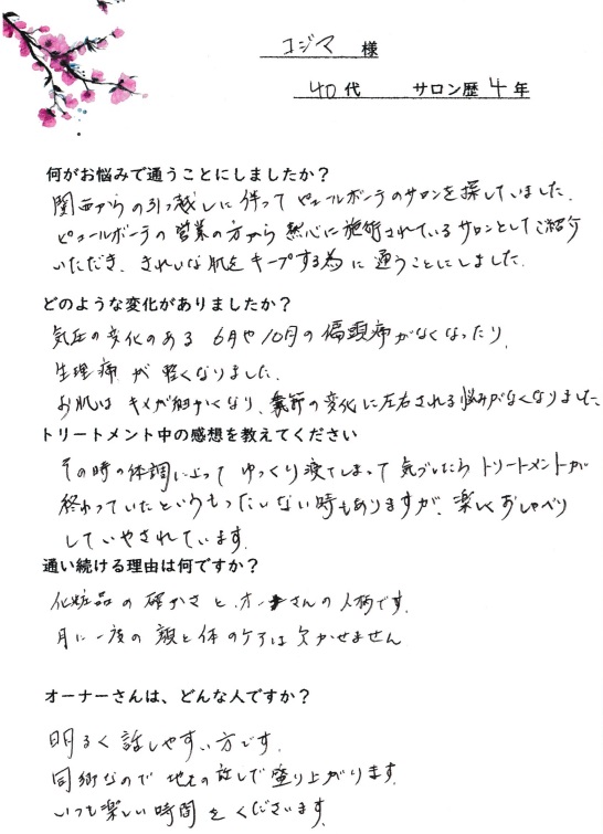 化粧品メーカーの営業さんから『熱心に施術されているサロン』と紹介されて通い始めました。キメが整うだけでなく、重だるかった季節の変わり目もスッキリ軽やかに過ごせるように。お肌も体もリズムが整い、オーナーさんとの楽しいおしゃべりにもいつも癒やされています。」(40代・コジマ様)