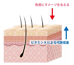 お肌の若返りに必須の「ビタミンA」による代謝サポートに着目。お肌の土台(角質層のすみずみ)に働きかけ、内側からふっくらと押し上げるようなハリを与えることで、一切ダメージを与えずに古い角質がごく薄く剥がれ落ちていく画期的なシステムです。